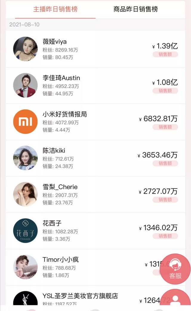 (8月10日抖音销售额排行榜,小米直播间位列第十)