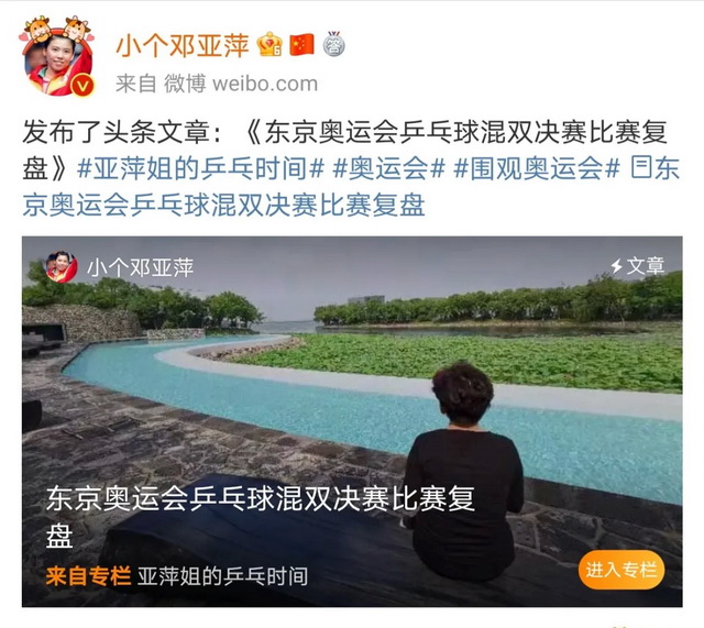退役运动员也在围观赛事的同时加入到讨论之中。在乒乓球混双决赛失利后,邓亚萍一篇《东京奥运会乒乓球混双决赛比赛复盘》的长文在微博流传,文中对本次比赛过程做了全面的复盘。专业的点评赢得网友好评,这篇文章阅读量也超过千万。
