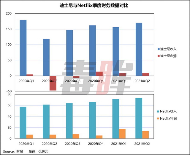 若将迪士尼和Netflix的财务数据并置,可以发现两者过去一年半的走势变化。在疫情的催化下,迪士尼和Netflix提前进入了同一牌桌。