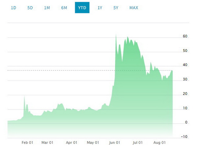这得益于AMC今年以来股价的火箭蹿升:早在1月底,AMC便曾在一天之内飙涨逾300%,经历数月的平静期后,AMC6月初股价一度暴涨95.22%至每股62.55美元,随后两天分别跳水17.92%和6.68%,股价走低后报收于47.91美元。