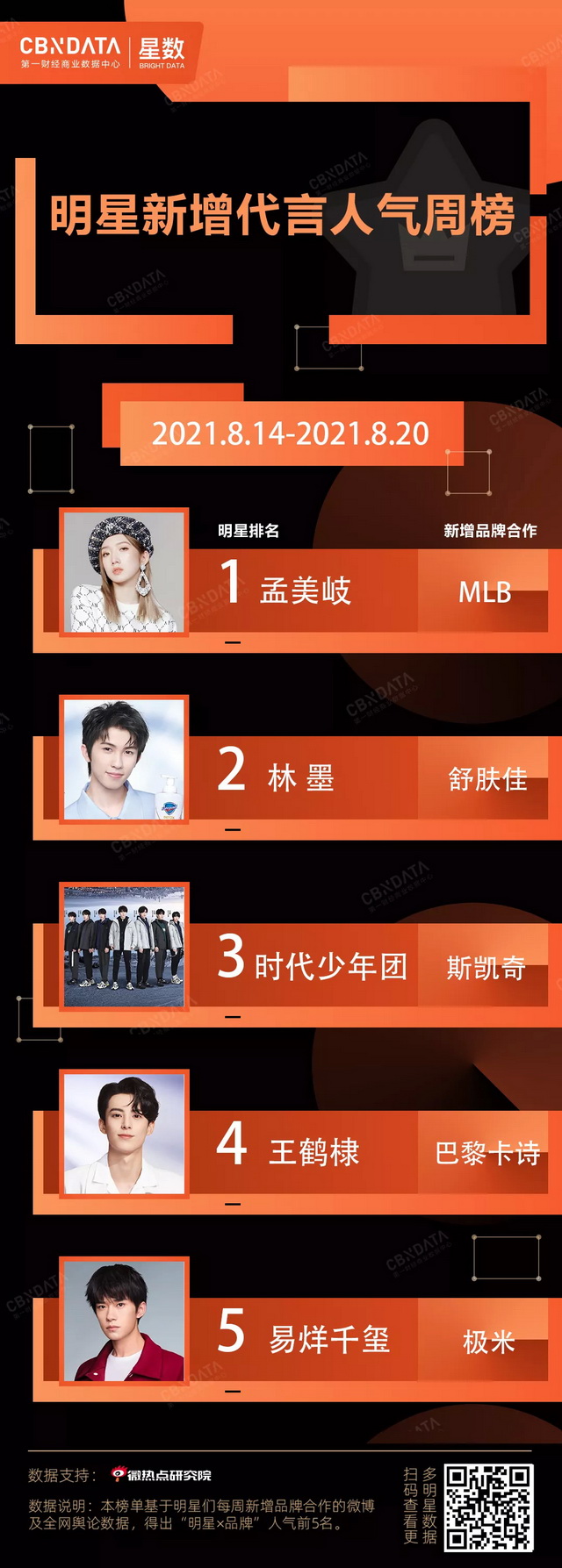 榜单基于明星每周新增品牌合作的全网舆论数据,得出“明星×品牌”人气TOP5。