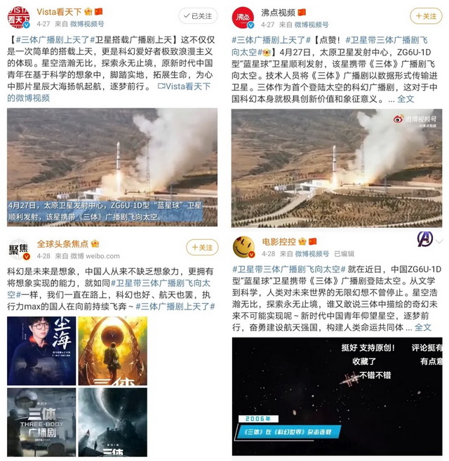 在《三体》爱好者们激动发博的同时,喜马拉雅在微博搭建话题阵地#卫星带三体广播剧飞向太空#、#三体广播剧上天了#,为《三体》广播剧打call。@Vista看天下、@沸点视频 等媒体账号,@微博动漫、@电影控控等电影电视领域KOL也纷纷发布微博扩散。