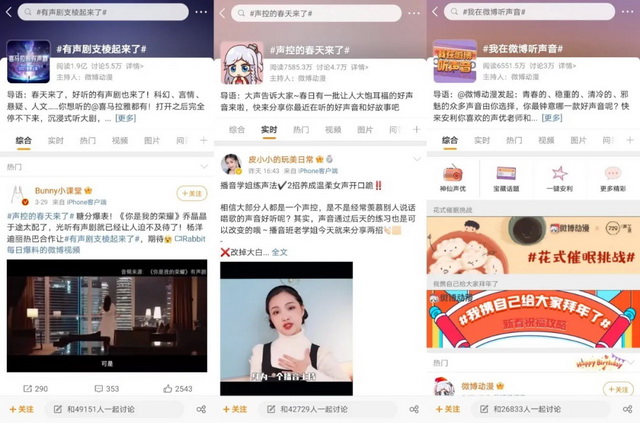 近几年,有声剧、广播剧凭借着配音演员的演绎,以声音激发想象力,吸引着越来越多的用户成为爱好者。而微博因为社交场域属性,是众多配音演员分享日常的平台之一,同时也聚集着大量泛二次元用户,成为《三体》等广播剧的主要宣传阵地。