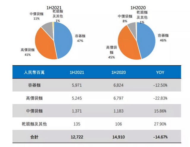 财报显示,2021年上半年,康师傅方便面业务实现收入127.22亿元,同比下滑14.67%,净利润8.9亿,同比下降近五成;统一的数据显示,2021年上半年,核心的方便面业务收入43.9亿元,较去年同期的50亿亦出现明显下滑。