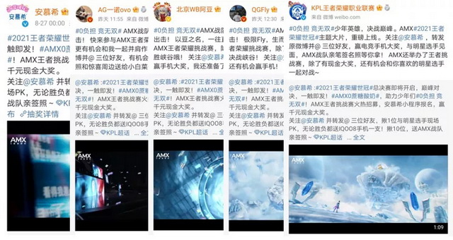 @安慕希 在发布AMX品牌短片后,@AG一诺ovo 、@北京WB阿豆 、@QGFly 以及@北京WB王者荣耀战队 和@KPL王者荣耀职业联赛 相继转发,让这支短片传递到电竞核心人群中,快速、直接,一塔拿下!