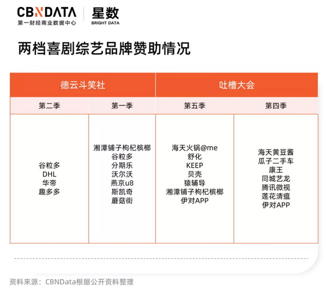 如果将该节目前几季以及其他喜剧综艺纳入考量范围,不难发现该类节目有着独特的商业吸引力。总体来看,食品饮料品牌仍然占据重要地位,且同一品牌对于喜剧内容具有一定的忠诚度,例如海天分别以黄豆酱和@me火锅底料赞助了两届《吐槽大会》,谷粒多则承包了两季的《德云斗笑社》;但同样是营销大户的美妆品牌却几乎在这部分内容中缺位了,《德云斗笑社》中未出现美妆品牌的身影,《脱口秀大会》和《吐槽大会》仅出现英树一个品牌,可见美妆品类对于此类内容的喜好度并不高。
