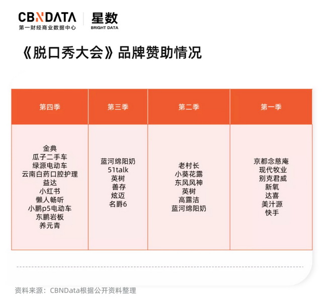 从本季具体品牌来看,综艺植入大户金典替代了两季合作品牌蓝河,云南白药除了口腔护理产品支线,还带上了其洗护子品牌养元青,小鹏、东鹏岩板、懒人畅听等新面孔也悉数亮相于赞助商名单。