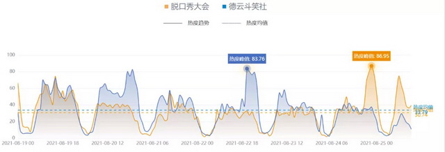 8月10日,由杨澜、大张伟、罗永浩、李诞担任新领笑员的《脱口秀大会4》率先开播,10天后,由郭德纲、于谦等德云社相声演员共同出演的真人秀《德云斗笑社2》紧接着上线。时隔一年,这两大喜剧头部IP也成为了近期的热门内容来源。微热点数据显示,近一周内,两档节目多次达到80以上的峰值水平,其中《脱口秀大会4》热度更为可观。
