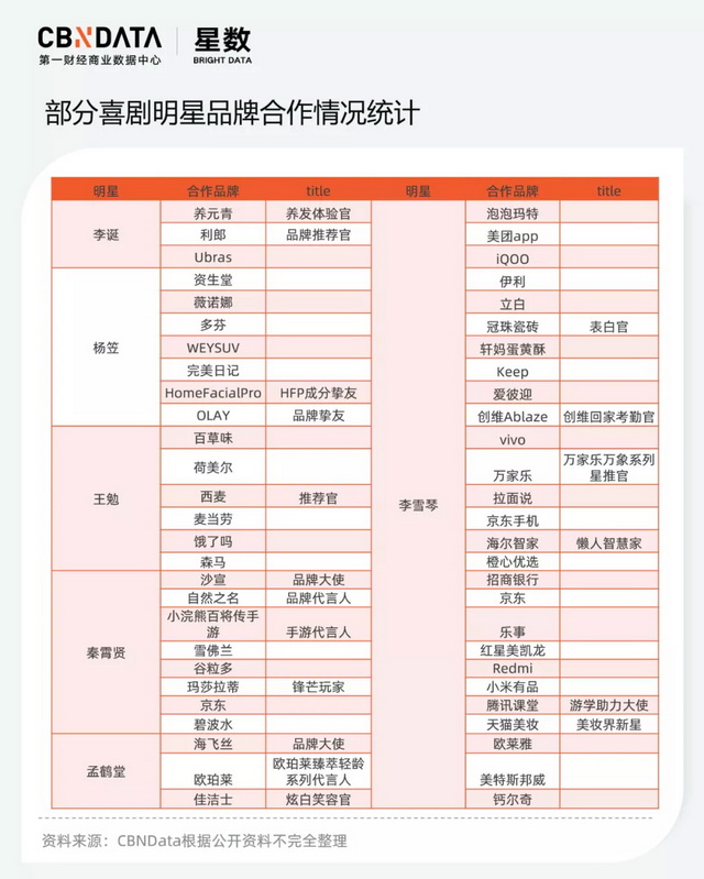 值得注意的是,这之中给出品牌代言人或者大使的品牌仍在少数,大部分喜剧明星的合作止步于宣传物料或者事件营销。这与喜剧明星本身的商业价值有关,虽然同样具备流量,但他们自身并不拥有忠诚度与追随度超高的粉丝群体。就带货效果而言,他们的消费影响力与真正的明星演员仍有不小差距。