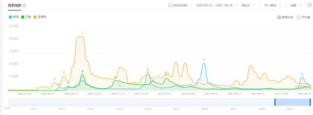 以《脱口秀大会第三季》出圈的三位脱口秀演员杨笠、王勉、李雪琴为例,在节目播出后,三人的百度搜索指数有了大幅度上升,偶有峰值事件发生。