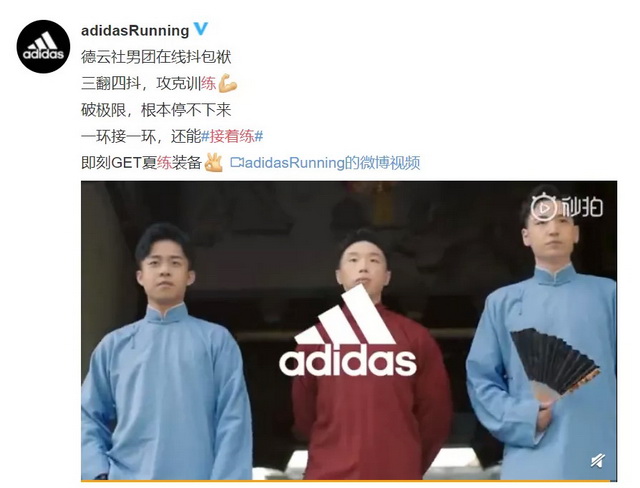 2019年,德云社相声演员烧饼、张九龄和王九龙接拍了一部阿迪达斯广告,广告充满了老北京风格,三位德云社演员在四合院的院子里,身着阿迪达斯的服装进行各种健身运动,这也是阿迪达斯首次启用相声演员拍摄广告。相声演员嫁接运动品牌,看起来不太搭的组合反而激发了外界的热议。