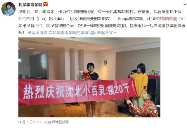 类似的案例还有Keep和李雪琴的合作。4月,Keep发布了一款单车产品,并向李雪琴发起减重挑战, 6月3日,李雪琴作为回应发布了一则视频宣布成功减重。作为运动健康品牌的Keep选择李雪琴这种“满脸写着拒绝”的选手作为合作对象进行瘦身挑战,这种充满反差的跨界也打破了外界对双方的预期,既具有喜剧性同时也不乏说服力,最终该次营销话题#跟着骑就瘦了#获得了1.6亿的话题阅读量。