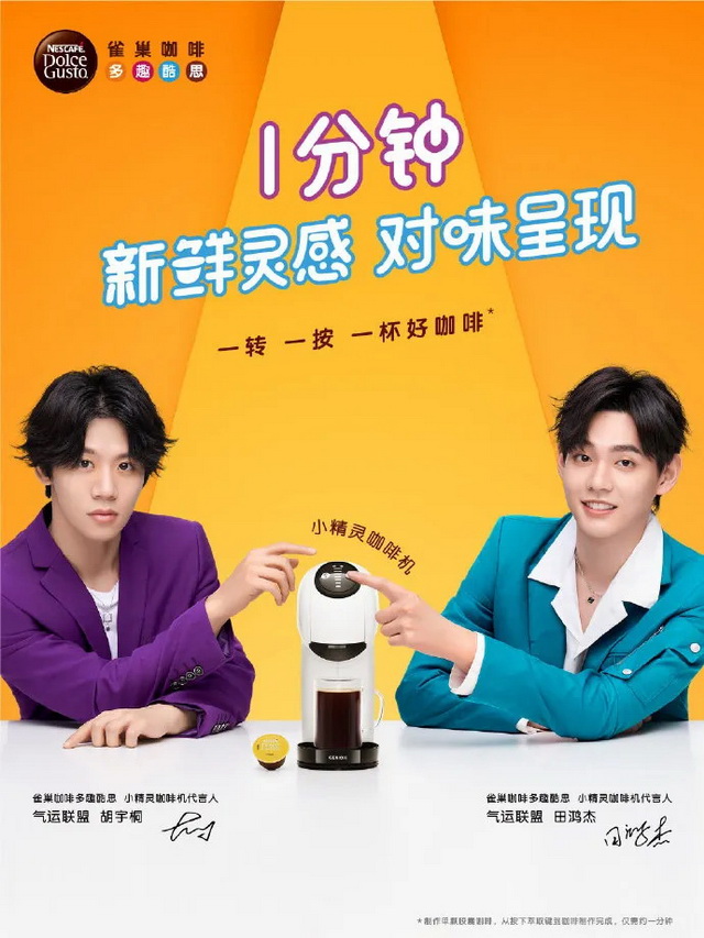 9月1日,胡宇桐和田鸿杰成为雀巢咖啡多趣酷思小精灵咖啡机代言人。