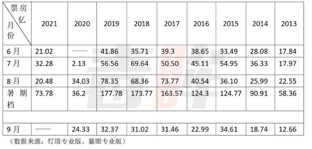 暑期档开局,6月的21.02亿票房,已经倒退回2014年之前水平。接下来的两个月,非但没有补上6月的票房窟窿,甚至还在8月交出了20.49亿的成绩。