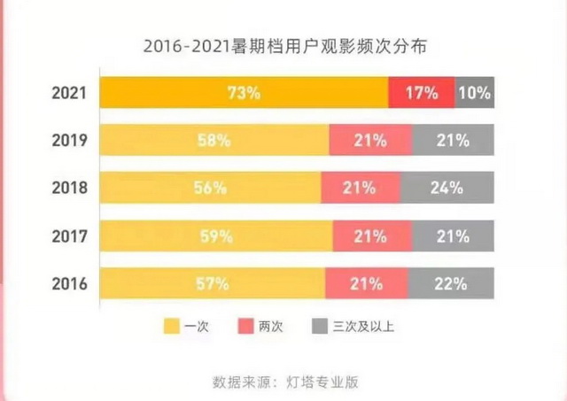 而由于爆款电影的数量较少,和往年相比,观众的观影频次也有所降低,灯塔专业版数据显示,今年暑期档只看一次的用户比例达到73%,2016—2019年这一比例均未超过60%。