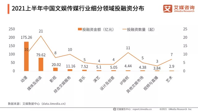 艾媒数据中心显示,2021上半年,中国文娱传媒行业共发生了88起融资事件,共融资319.29亿元。其中动漫领域共发生10起融资,融资金额达到175.26亿元人民币,平均每笔融资近20亿元。影视发生了8起融资事件,融资金额仅达到20.02亿元,不足动漫的平均值。