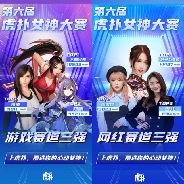 不仅如此,今年的女神大赛还特意制作了专门的版面,当中有明确的赛程可供查看,PK进行中还能看到票数实时变化的曲线,营造出了一股类似体育赛事的紧张氛围。同时,虎扑还参考了直播平台的“粉丝牌”玩法,设置了女神徽章,用户在全站发帖回帖时,都会在ID之后显示出自己支持的女神是谁。正赛之余,虎扑甚至同时推出了副赛道,包括游戏赛道和网红赛道。