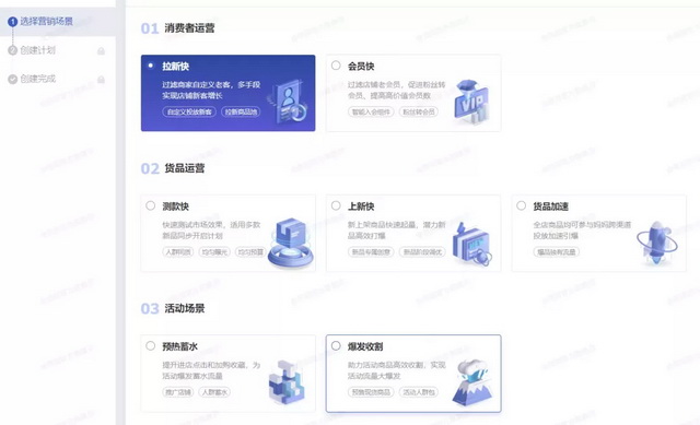 今年双11前,阿里妈妈推出了全新的工具万相台,让投放成了一种“傻瓜式操作”。如果一个商家需要使用万相台拉新,只需要三步:选择营销场景;在营销计划中填上营销预算,点选店铺商品,选择希望投放的地域;完成。
