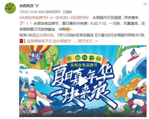 自有品牌的建立为永辉注入新的活力。今年7月,永辉官方举办“永辉自有品牌节”,以“夏日嘉年华,一块来浪”为主题,通过1元购、促销直降、晒单赢万元旅游基金等多种活动激发消费者热情。这种迎合电商气质的“造节”行为,也成为永辉打通线上线下,加深品牌印象而做出的新尝试。