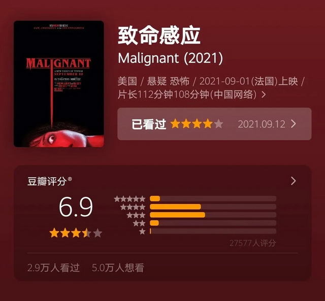 9月10日,由华纳兄弟出品、恐怖片大师温子仁执导的电影《致命感应》(Malignant)在爱奇艺、华为视频等六家平台上线,实现了与北美院线和HBO MAX流媒体平台的同步放映,内地市场也迎来了史上第一部全球同步发行的R级恐怖片。