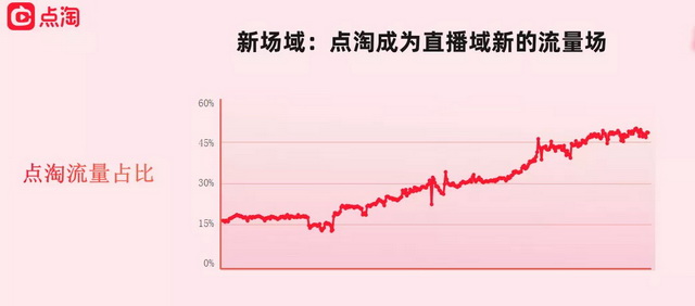 道放公布的数据显示,点淘在直播流量上已经占到淘宝+点淘整体直播流量的50%以上。这意味着除了主站手淘之外,点淘已是带动直播新增用户很重要的入口。