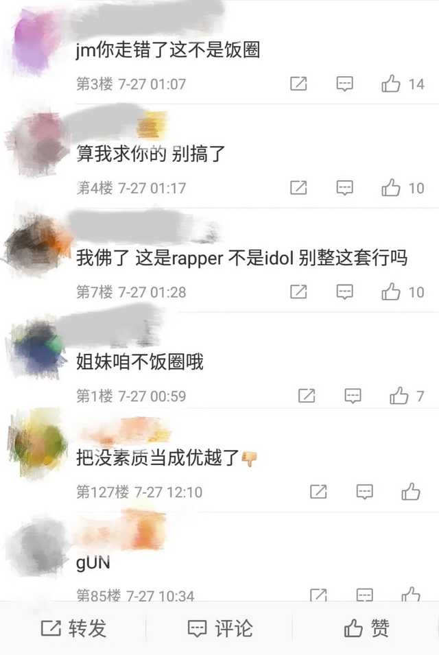 说唱圈层的原有受众看不上所谓的“饭圈”,他们认为最好的方式是听歌看演出,而不是像普通爱豆粉丝那样喊着“崽崽”“哥哥”。女粉多、粉丝饭圈化程度较高的rapper,如福克斯、姜云升等,在说唱圈层内部普遍评价不高,甚至不少rapper公开表示过对饭圈式粉丝的不满。