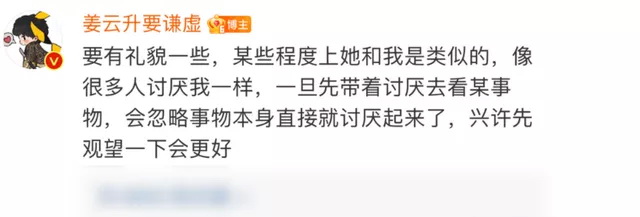 比较典型的例子是今年6月,姜云升官宣和鞠婧祎发布合作曲时,大量粉丝非常不满,甚至集中在姜云升的预告微博评论里表述对鞠婧祎的讨厌,导致姜云升在评论留言“要礼貌一些”,并在之后的直播中规劝粉丝。