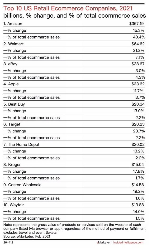 在线上交易额分散的美国,亚马逊、沃尔玛和ebay这三大平台的零售额总和只占全美线上零售市场一半,前十名份额相加,也仅仅达到66%(数据来自eMarket,2021)。其余份额,大多被长尾的品牌独立站瓜分,苹果官网甚至能以线上成交额位列第四。
