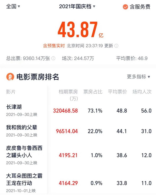 灯塔专业版显示,截至今天23:40国庆档(10月1日-7日)总票房报收43.87亿,比去年同期的39.67亿高出了4亿,略低于2019年同期创造的44.66亿历史最高纪录——比刷新纪录更重要的,是这尘埃落定的43亿多票房,一扫此前低迷了半年之久的电影市场的阴霾,给了行业久违的惊喜和信心。