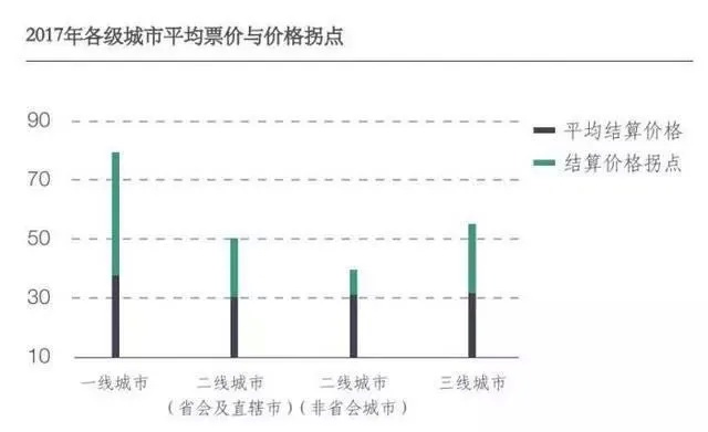 从当年凡影的调研结果来看,不同地区的价格拐点各不相同,像北京、上海这样的一线城市的价格拐点分别为80多元和近60元,而今年国庆档这两个城市的平均票价为59元和58元,也就是说北京的票价依然有上涨空间;拓普数据显示二线和三四线城市的平均票价为46和44元,接近“省会及直辖市的二线城市的票价拐点在50元”这一水平线,上涨空间不大。
