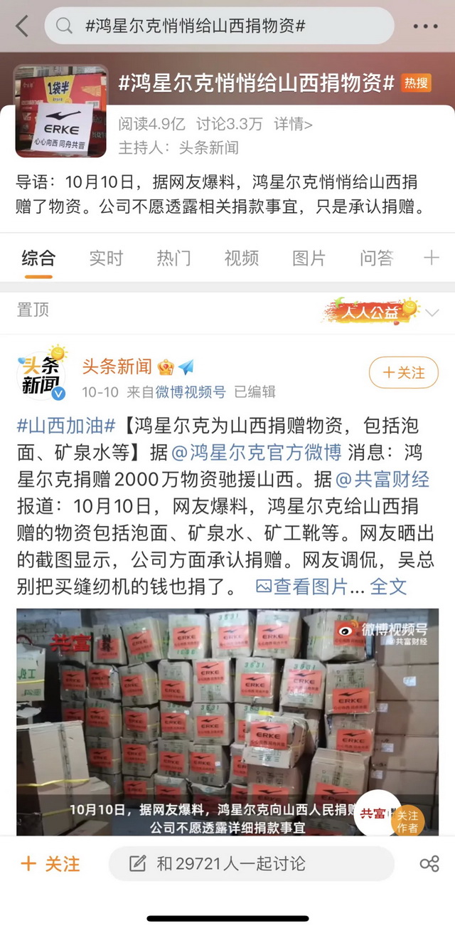 前一晚,话题#鸿星尔克悄悄给山西捐物资#登上热搜榜首位,起因是有网友先爆料鸿星尔克给山西捐赠了物资,而后公司方面才承认了捐赠行为。