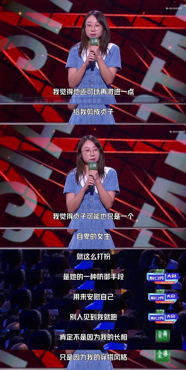 如王勉退赛后与颜怡颜悦姐妹重返舞台的“三胞胎”组合,讲女生穿短裙加打底裤的生活细节,引起观众的共鸣,张骏解读的男子气概焦虑,也让看惯了讨论容貌、身材问题的观众们,体会到容貌焦虑并不是女生独有。