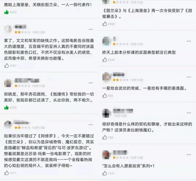 截至目前(2021年10月22日),《图兰朵》上映8天,豆瓣上的评分已从3.7降到3.5,打分的一万多人里,有53.1%的观众给出了一星。热评里大家对《图兰朵》的吐槽甚至比电影本身更有意思。