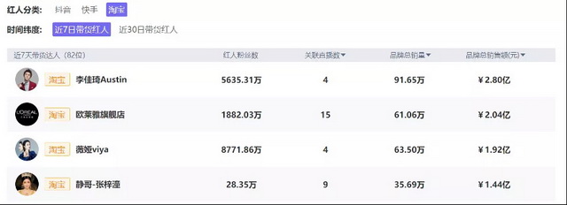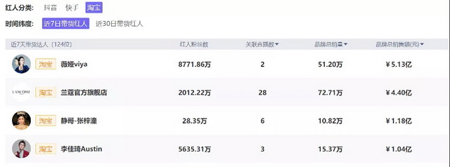 小葫芦监测数据显示,近7天之内,兰蔻官方旗舰店开播28场,带货金额4.4亿,薇娅为其带货2场,GMV达到5.13亿;雅诗兰黛旗舰店开播35场,带货金额5亿,超过李佳琦4场带货的4.23亿和薇娅5场带货的3.22亿;欧莱雅旗舰店开播15场拿到2.04亿,也已经和李佳琦带货4场的2.8亿接近。