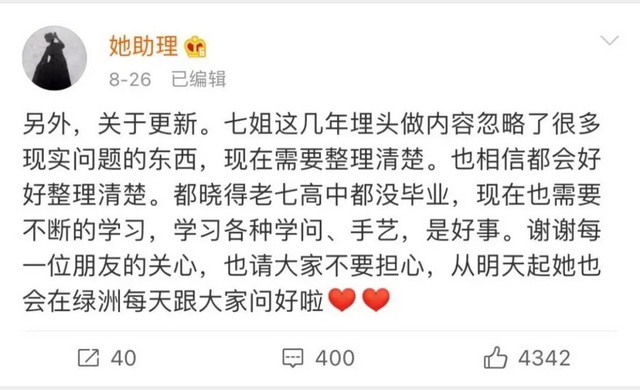 “七姐这几年埋头做内容忽略了很多现实问题的东西”,“七姐最近只是暂时在整理公司与第三方公司的问题”。这两段李子柒助理的澄清,尽管没有实际指出微念和李子柒的争端,但很大程度上证实了网友的猜测。