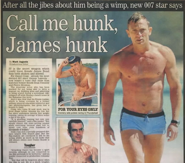 意料之外的转折很快到来,只因为某天,有狗仔队在剧组去沙滩拍摄的前一晚把自己埋进沙子里,蹲拍到了一张克雷格赤裸上身从海里走出来的照片。
