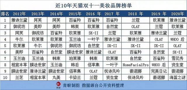 10年前,双11热潮开始从线上蔓延至线下,据2012年的美妆双11排行榜显示,外资大牌雅诗兰黛夺得了那届双11冠军,但以御泥坊、阿芙、膜法世家为代表的国货美妆,却拿下了前十名中的6个席位。
