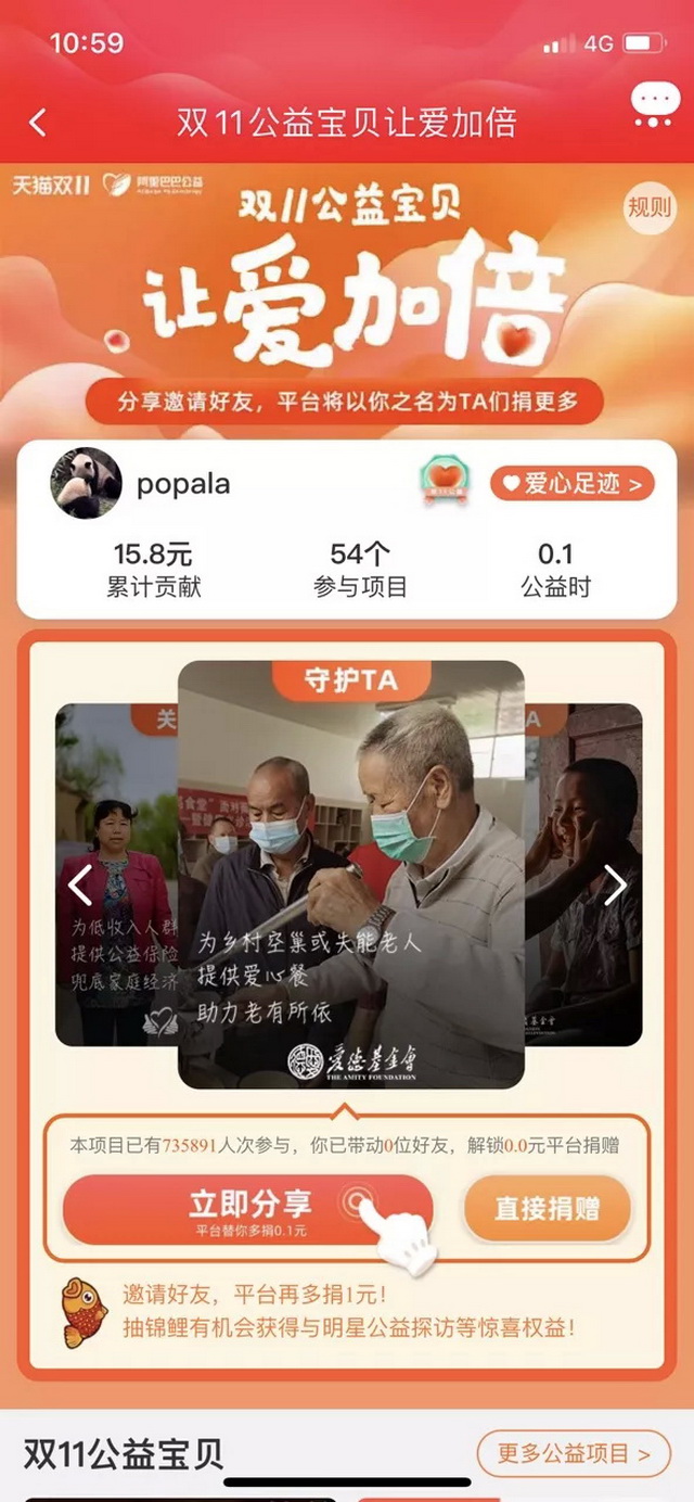 在整个双11期间,有300万款商品,被商家们设置为双11公益专项,定向帮扶困境人群。消费者在天猫上每买10件商品,就至少有一笔2分钱或更多的善款,通过公益宝贝捐向特定的公益项目。