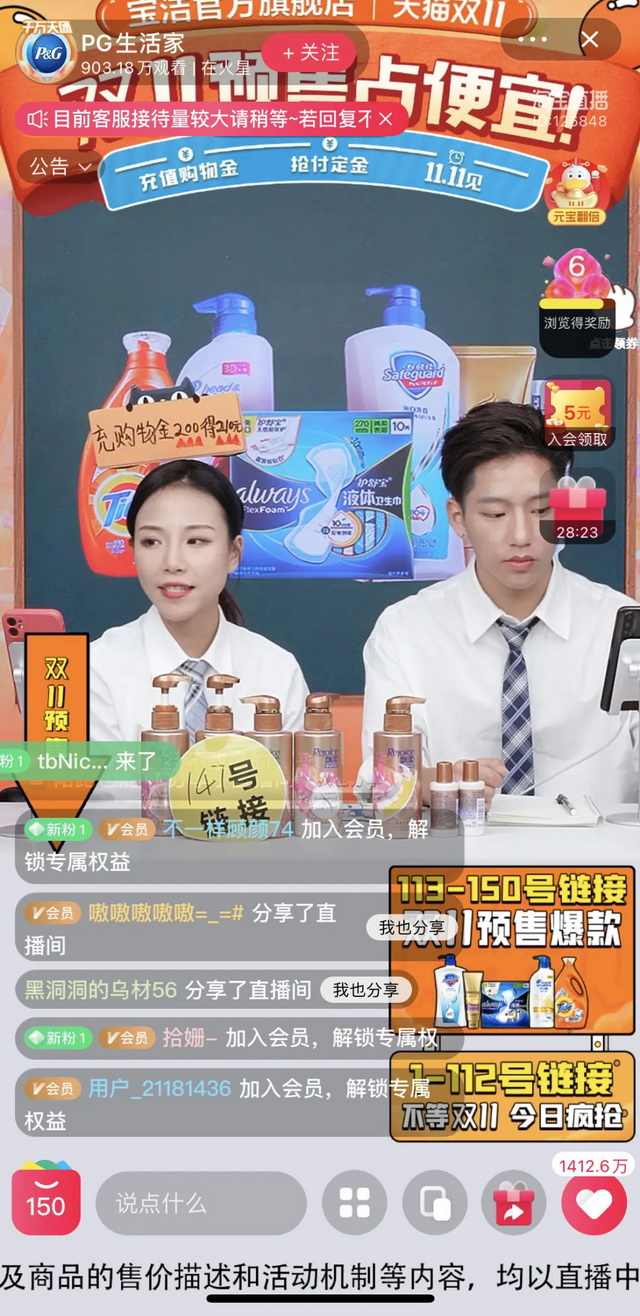 实际上,今年双11的商家直播间呈现出比以往都更热闹的状态。主播们头戴定制发箍,手举卡牌,各种细节都透传出优惠权益,尤其是膨胀金、会员充值得优惠券、充多少送多少等等优惠方式。以往在店铺私域用图文形式展示,对消费者的触达效率不高,但商家自播间是一个很好的把内容展示和动态客服充分结合的场域。