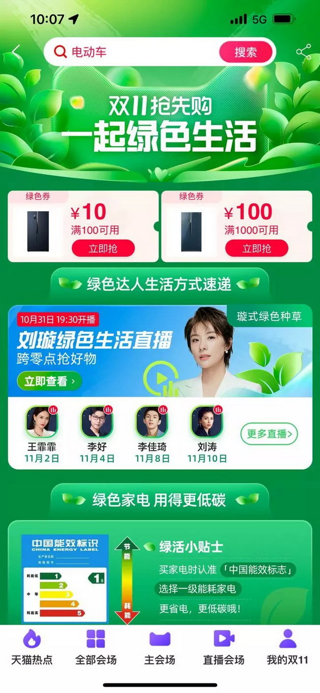 “绿色会场”首次出现在网站首页,推荐的都是有助于环保、节能减排的节能家电、绿色食品等,还有“新能源汽车”专区。平台同样发放了很多“绿色优惠券”,以此推广消费者的绿色低碳购物体验。