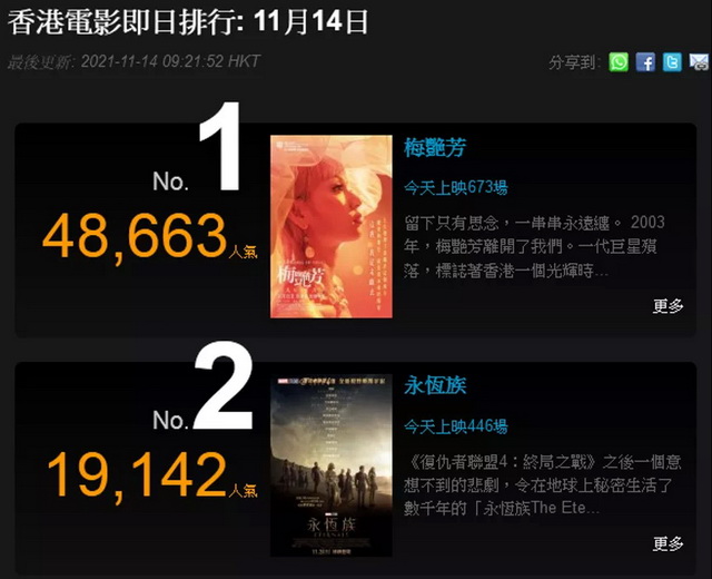 在即日排行榜上,公映首周末《梅艳芳》便无悬念登顶,并以逾1倍的优势压制漫威新作《永恒族》,后者刚于一周前登陆大银幕。《梅艳芳》与其他好莱坞大片相比也毫不逊色:漫威亚裔超英电影《尚气与十环传奇》首日票房为318万港元,在所有周四公映影片中名列前茅。虽然《梅艳芳》于周五亮相略占优势,但与《尚气与十环传奇》的单日差距不足10万港元 ,显示传记片的票房潜力不容小觑。