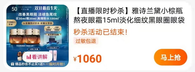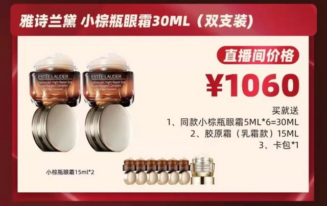 比如雅诗兰黛直播间30毫升的小棕瓶“买一赠一”再加一瓶100ml的粉水;薇娅直播间里两瓶15ml的小棕瓶搭赠6瓶5ml的同款小样,还送15ml胶原霜及卡包,虽然品牌直言“折扣力度前所未有”,但是实际价格上稍一对比还是缺少一点吸引力。
