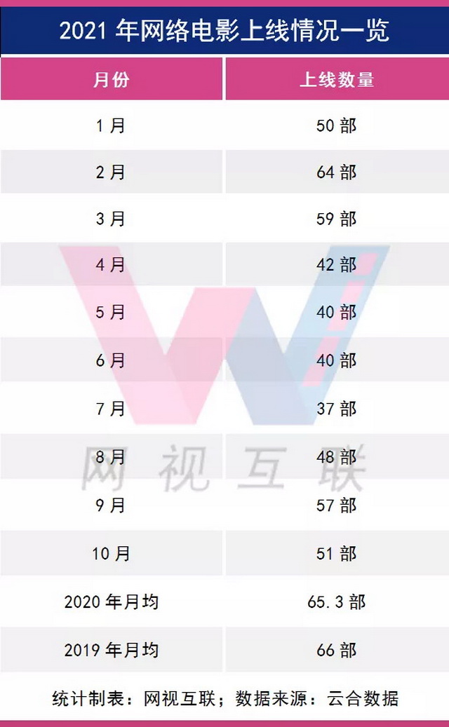 据云合数据提供给网视互联(ID:wxs360)的数据显示,10月份全网上线网络电影共51部,虽然远远低于2019和2020年的月均上线数量,但在2021年这个数字并不算低。