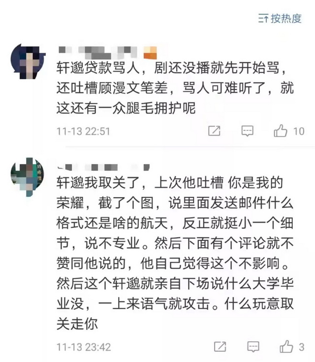 比如网友就曾在微博上指责轩邈“吃相难看”,一边通过蹭流量涨粉,一边又阴阳怪气内涵“饭圈”等等。“剧好不好另说,但专门针对特定明星,哗众取宠,利用大众戾气赚钱,真的很令人反感。”有网友这样评价。