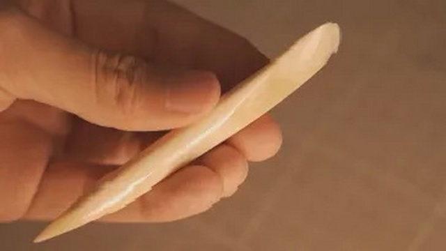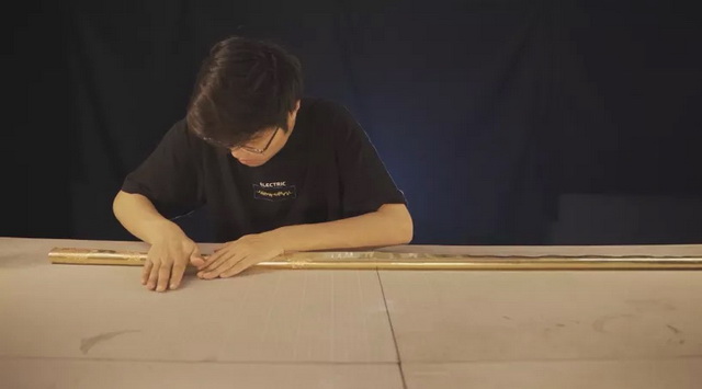 不过才浅并没有因此放弃,他查阅资料了解到,牛骨软硬适中不会划破黄金,也不会像玛瑙刀那样留下划痕,所以又自制了适合压刻黄金的牛骨刀。最后,采用古蜀人的制胶方法,用鱼泡做成鱼鳔胶,将金带粘在木杖上。至此,才浅耗时四个月,做出了自己心中三星堆金杖的样子。