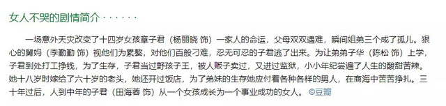 菲菲对此并不意外,毕竟《星辰大海》是母亲近期最为沉迷的剧集。从小,她就陪着妈妈看过不少女主人公历经坎坷,实现人生逆袭的剧,其中《女人不哭》的剧情(如下图)堪称2006年版的《星辰大海》。