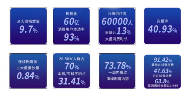 据《2020抖音娱乐白皮书》统计,剧情类短视频内容占大盘播放量9.7%,投稿量60亿,消费用户渗透率93%,完播率40.93%。截止到2020年11月,剧情垂类累计投稿作者超过1821万,一共投稿了超过60.16亿。