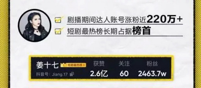 短剧的创作者,无论是影视公司还是达人,除了现金收益,还能收获更长尾的流量收益。《恶女的告白》剧播期间,主演姜十七账号涨粉超过220万,在站内站外都有破圈式影响。