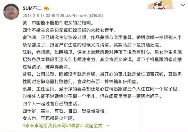 2018年后,生长于互联网时代、同时是观剧主力的90后即将奔赴三十岁,也开始对“30+”女性话题感兴趣。著名的网友脑洞《淑女的品格》正出现在这一时期。她们的视野也不再局限在“雌竞”上,这也给了一系列“30+”女性作为主角的群像剧提供了土壤。