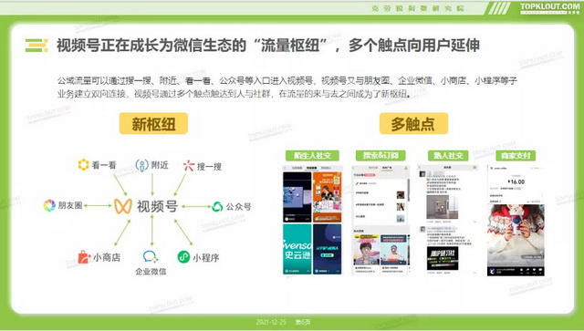 同时,视频号链接微信生态的打通能力,借助公众号、搜一搜、看一看等已趋成熟产品接入公域流量,又与朋友圈、企业微信、小商店、小程序等子业务建立双向连接,以社交、搜索、支付等触点深入用户,使好的内容辐射更多人。